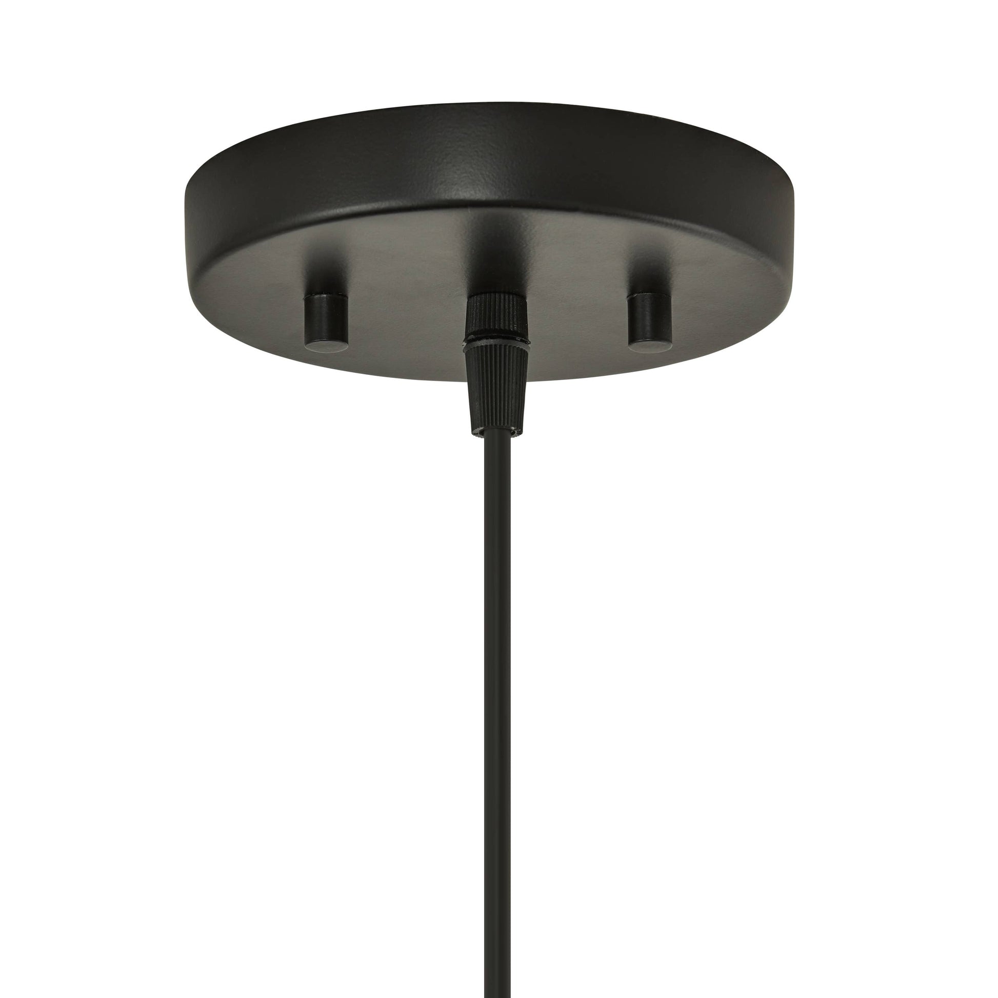 Featuring a satin black-finish metal canopy that mounts directly to the ceiling, this adjustable-height decorative pendant light has a rectangle-shaped metal cage detail with a geometric design in black attached to a brown mango wood shade.