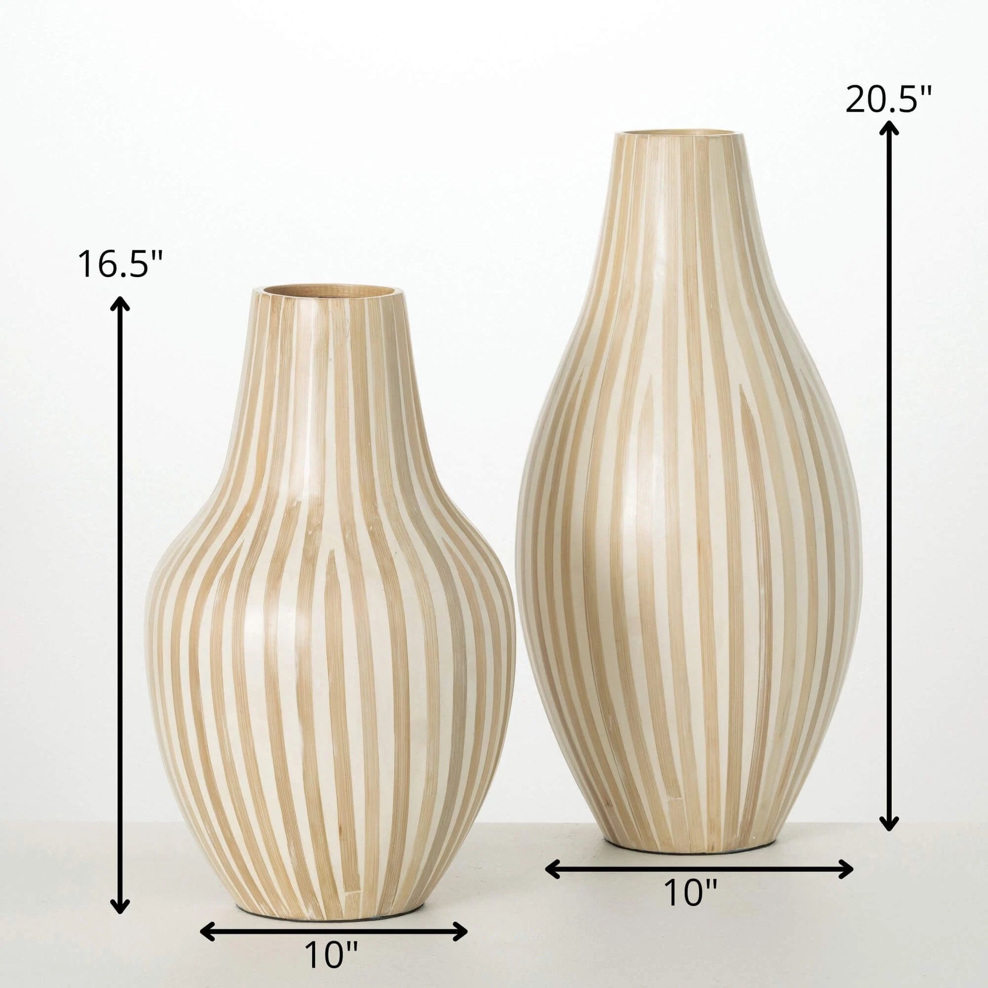 Bring the beauty of nature into your home with the Bamboo Vase Set. Crafted from sturdy yet stylish bamboo, features a fluted contrast look and natural colors that will complement any decor. The taller vase is perfect for displaying tall flowers or greenery, while the shorter one is ideal for smaller blooms. Whether placed on a table, shelf or mantel, this bamboo vase adds a touch of rustic elegance to any space.