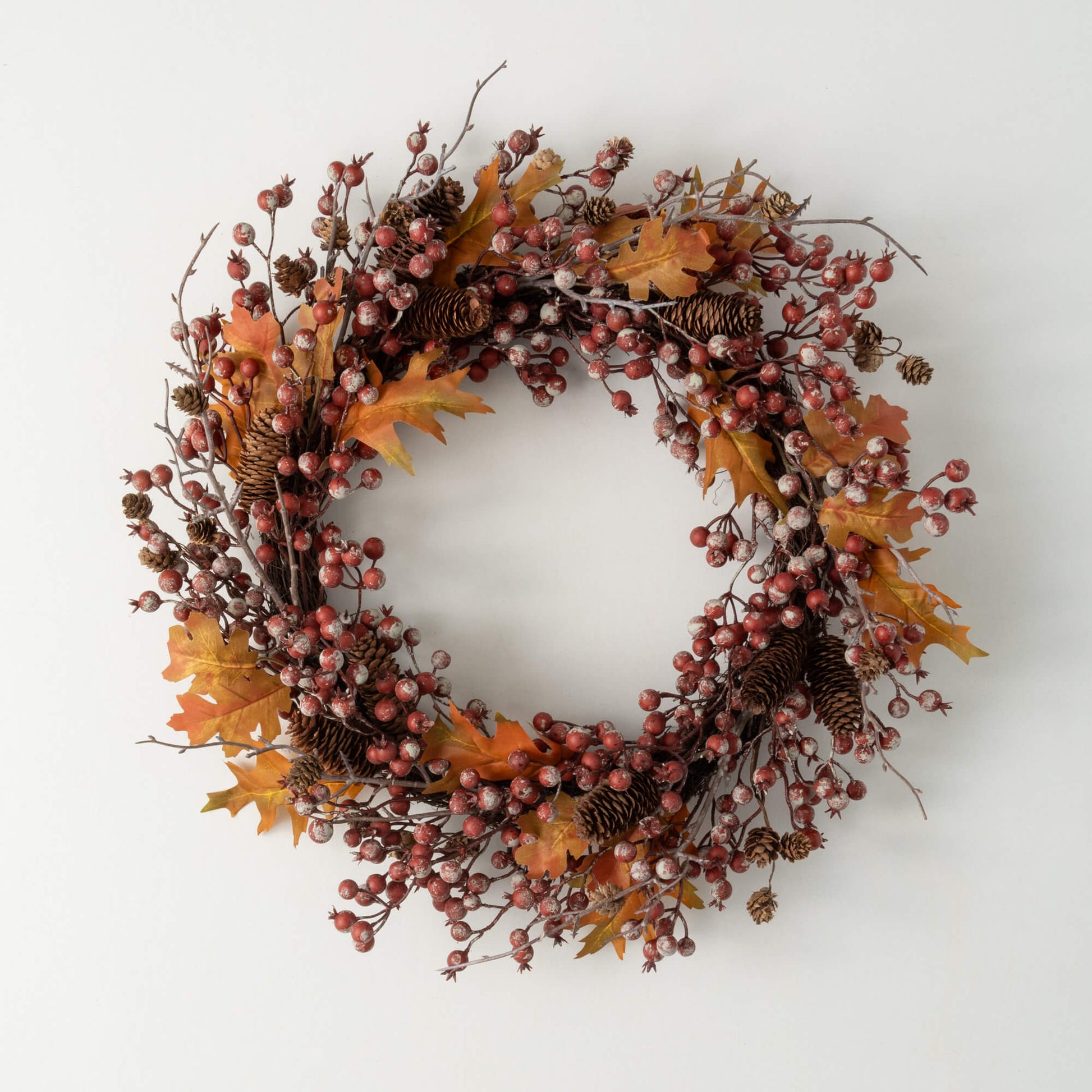 This exclusive fall wreath brings the colors of the season indoors. This generous-sized statement piece features mixed colorful berries and subtle leaves, perfect for cozying up your home during the cozy autumn season. Its rustic yet modern design will add a touch of warmth and charm to your home's decor. Perfect for a front door, tabletop or above a fireplace, this kaleidoscope of fall colors is a perfect enhancement for a variety of decor styles.