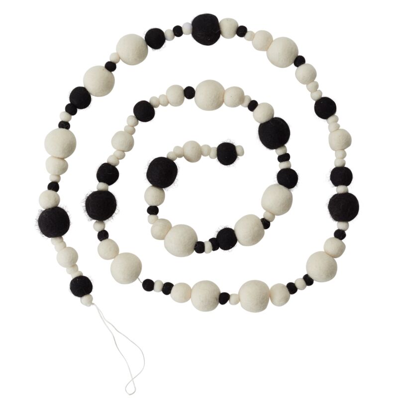 This garland is a whimsical and cheery strand of strung felted balls with a loop on either end. The graphic black and white colors feel modern and versatile.
