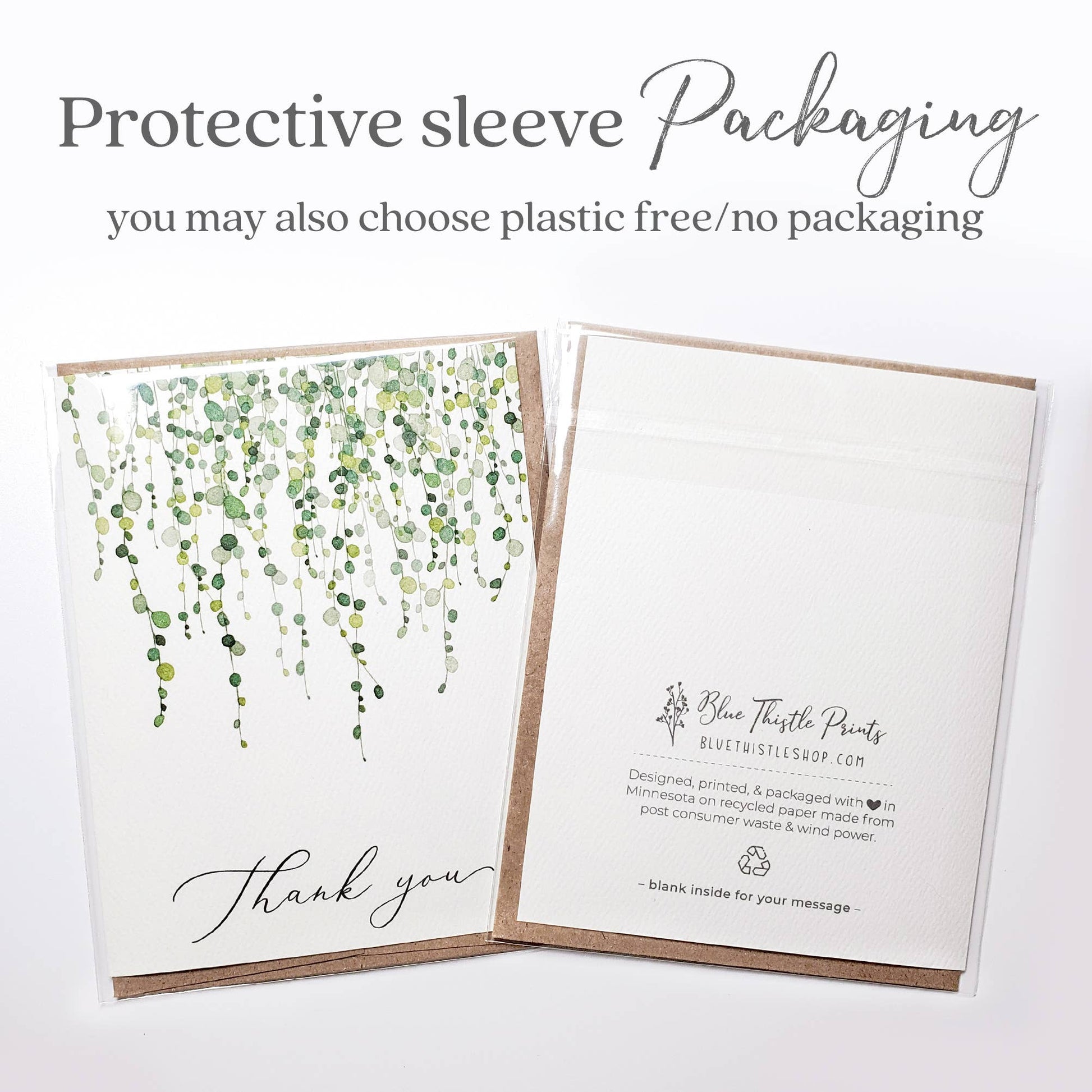 This plant themed thank you card is an elegant and eco-friendly way to thank friends and family. Each handmade card is printed on recycled paper that has a luxurious and uniquely textured feel. Includes sturdy, recycled kraft envelopes.