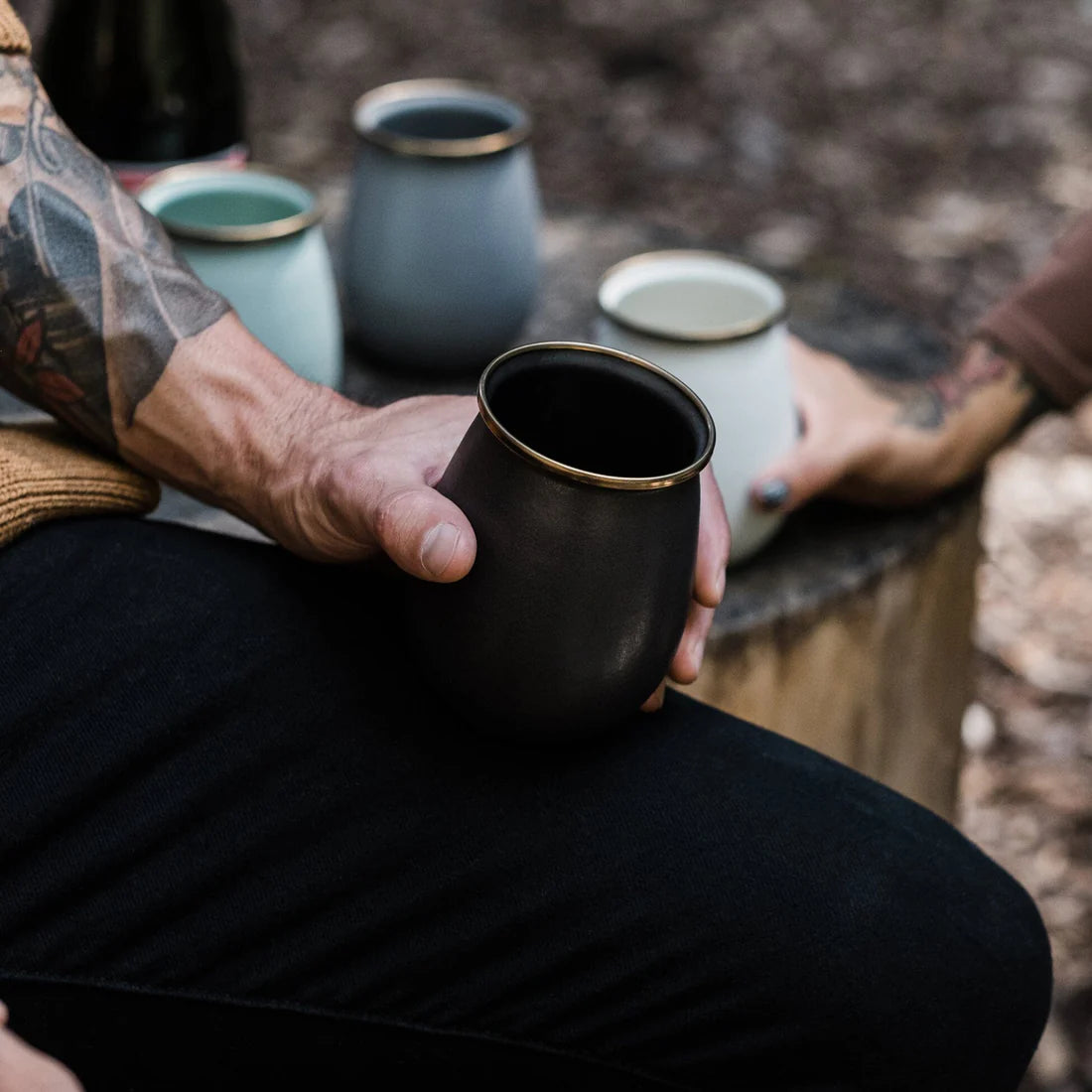This is a beautiful, rustic, enamel tumbler that evokes a sense of warmth and looks handsome both indoors and outside.