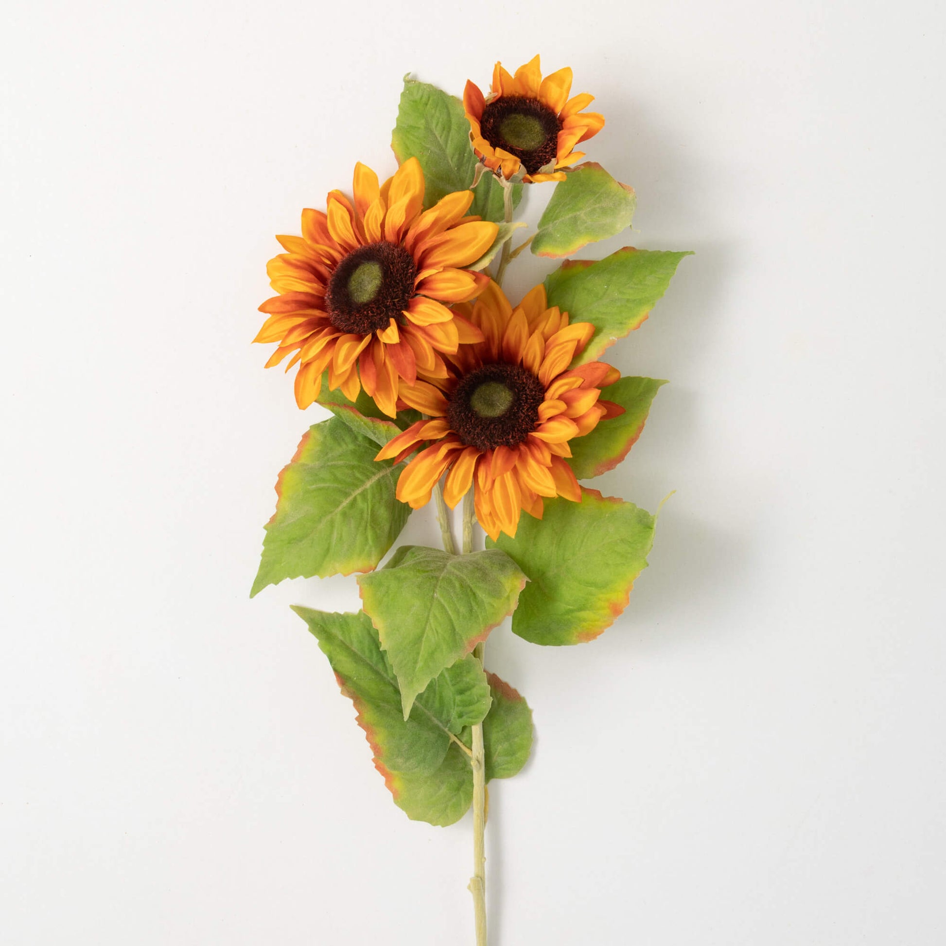 In the language of flowers, the bright and vibrant sunflower has a signature look that is unmistakable. Cheerful and iconic, these rust orange-petaled classics add a pop of color to any decor. Featuring a trio of blooms accented with green foliage, this faux favorite stays fresh season after season. Realize your unique vision with extraordinary faux floral stems trusted by top florists and interior designers worldwide. As with all of our high-quality artificial flowers, each flower stem is designed meticulously down to the last detail, including wired stems and leaves for true authenticity.