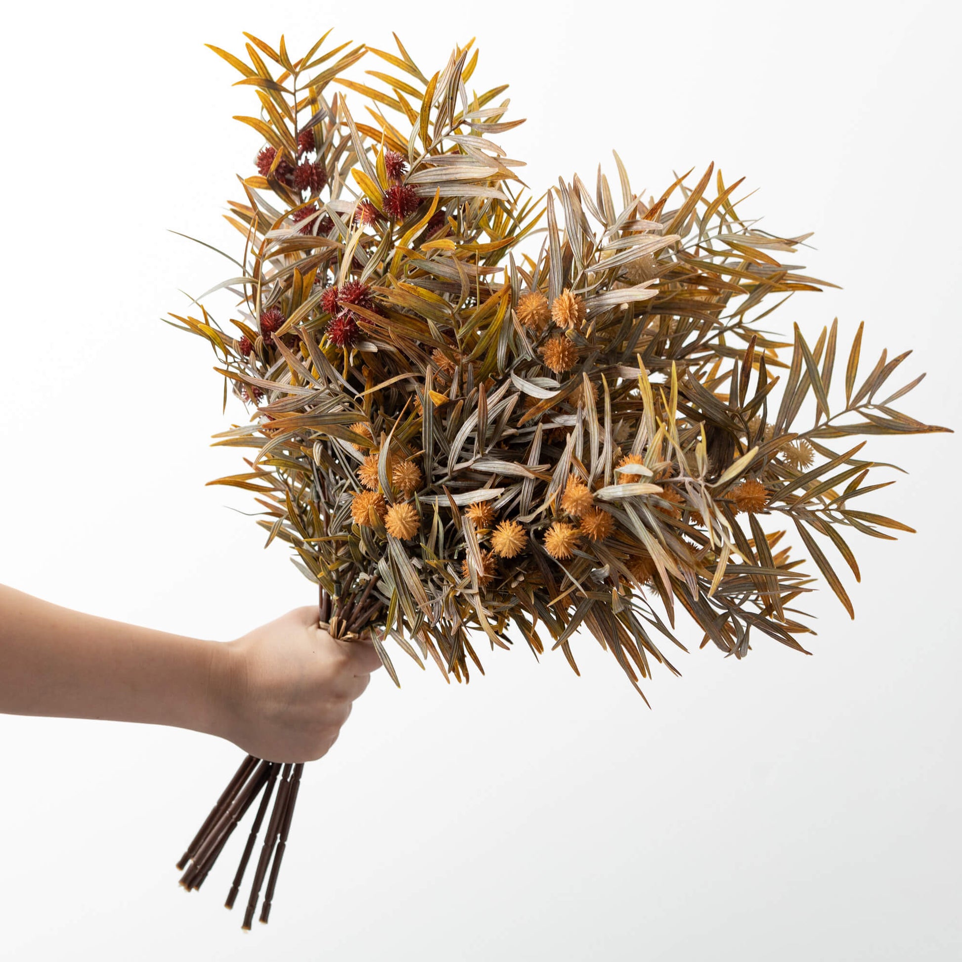 These neutral Fall Mixed Grass Bushes provide a subtle, subdued pop of autumnal color that's at home in any decor. The bushy faux foliage comes in varying tones of brown, tan and beige for a natural, neutral effect that blends seamlessly into your space. Perfect for adding a touch of visual texture or an understated seasonal accent, the three included tall grasses simply require fluffing and arranging to your liking.