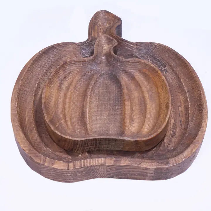 Celebrate fall with these Recycled Wooden Pumpkin Bowls. Hand-carved from sustainable wood and finished in a rich natural tone, these nesting bowls add rustic charm to your seasonal décor. Perfect for displaying treats, trinkets, or autumn accents.