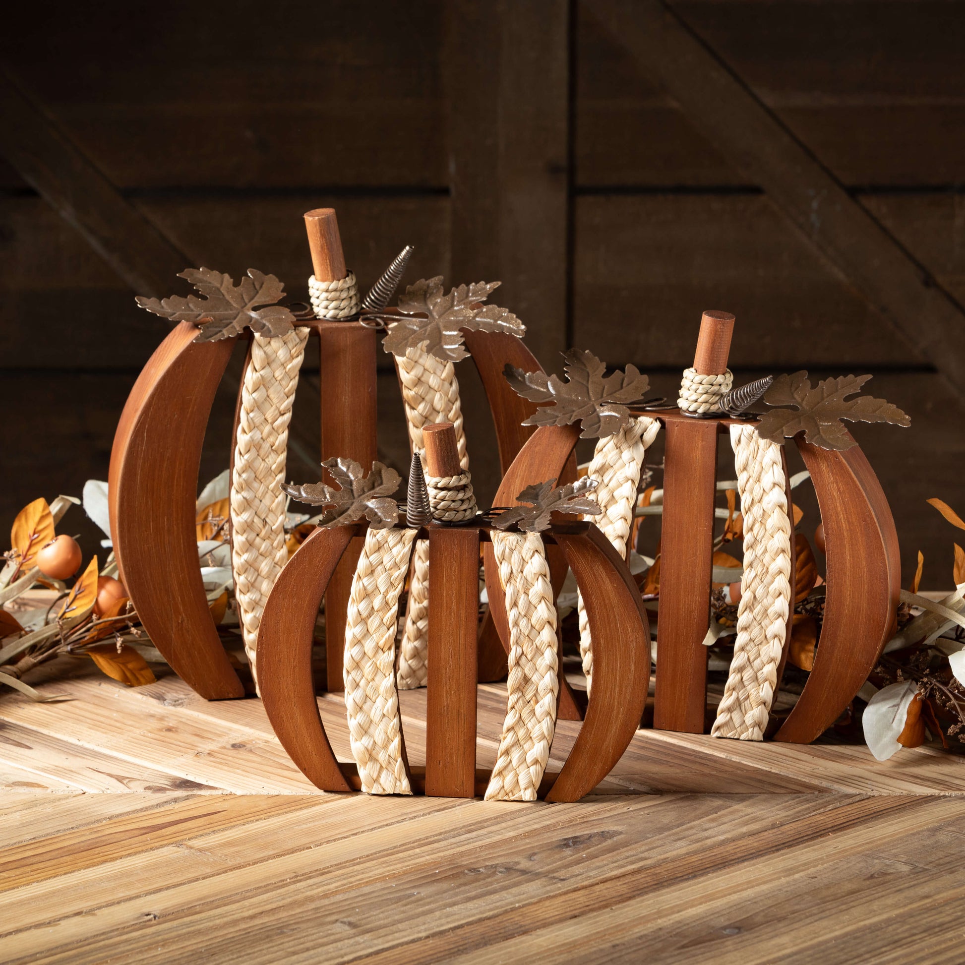This trio of rustic wood pumpkins brings a bountiful feeling to any fall decor. The three varying sizes add visual interest as they sit side by side, creating an effortless display that instantly evokes thoughts of the season's harvest. Set them on a windowsill, mantle or dining table to lift spirits and brighten any room. Their simple yet charming forms will complement any rustic or farmhouse-style decor, helping transform your space into a harvest haven.